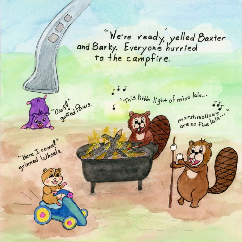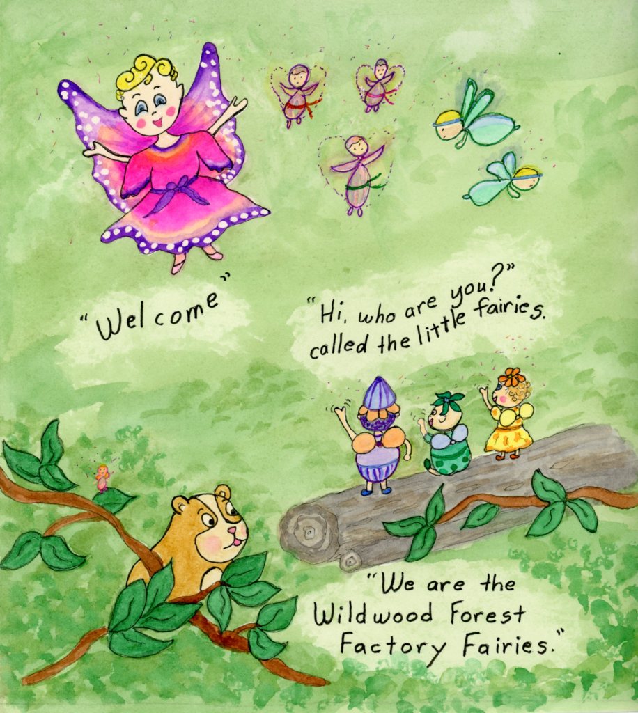 In the second book, the Little Fairies who live in Boy’s pocket, join Wheels and Paws on a camping adventure at Wildwood. The Little Fairies hear their favorite song, “This Little Light of Mine” up in the woods, so off they go to explore. Finding the Forest Factory Fairies, they join in manufacturing the ingredients for S’mores. Yummy. Join them around the campfire at Camp Wildwood.